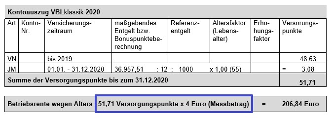 Musterbeispiel für Kontoauszug im Versicherungsnachweis VBLklassik