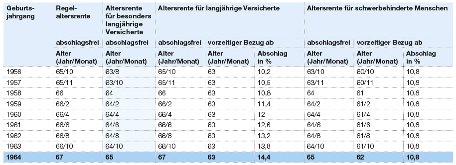 Diese Rente kann frühestens mit Erreichen der jeweiligen Altersgrenze in Anspruch genommen werden, selbst dann, wenn die 45 Versicherungsjahre schon davor erfüllt sind. Die Altersrente für besonders langjährig Versicherte wird ohne Abschläge bewilligt, bei der DRV und ebenso in der VBLklassik.