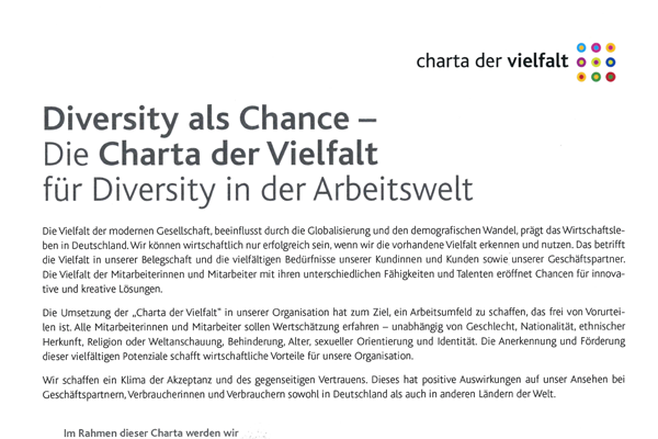 Die Charta der Vielfalt ist eine Unternehmensinitiative zur Förderung von Vielfalt in Unternehmen und Institutionen unter der Schirmherrschaft von Bundeskanzlerin Dr. Angela Merkel. Die Unternehmensinitiative wurde im Dezember 2006 von vier Unternehmen ins Leben gerufen. Mittlerweile haben bereits mehr als 2.750 Unternehmen und Institutionen mit insgesamt über 9,4 Millionen Beschäftigten die "Charta der Vielfalt" unterzeichnet.
