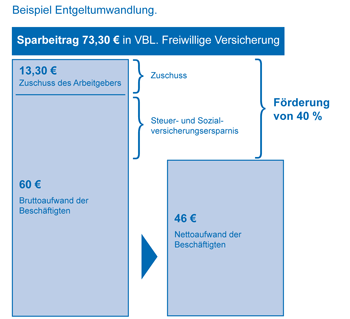 Für Beschäftigte im Bereich des kommunalen Arbeitgeberverbandes Niedersachsen, die eine Entgeltumwandlung von mindestens 60 Euro monatlich durchführen, wird hierbei übertariflich eine Aufstockung der bisherigen vermögenswirksamen Leistungen von 6,65 Euro auf 13,30 Euro zugelassen. Für Ihre betriebliche Altersversorgung werden so monatlich 73,30 Euro angespart. Wenn Sie Beiträge für die betriebliche Altersvorsorge im Rahmen der Entgeltumwandlung einsetzen, sparen Sie so die anteiligen Steuer- und Sozialversicherungsabgaben auf den vollen Anlagebetrag.
